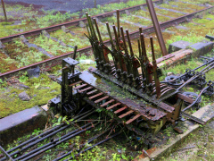 ポイント切り替え機。霧だらけの非常にさびやすい環境ですが、それなりに整備されていて、今も時折使われている様子がうかがえます。 |